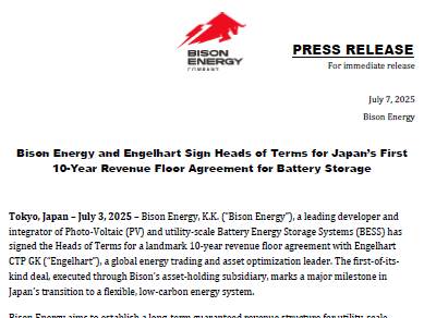 Bison Energyは、信頼性の高い経験豊富なサプライヤーや投資家と連携し、太陽光、蓄電、風力、バイオマスなどの再生可能エネルギー事業における企画提案、資金調達、設計、建設、運営までを一貫して手がけています。 揺るぎない企業価値観と高い倫理観を基盤に、私たちは世界でも屈指の「誠実で信頼でき、積極的に挑戦する」再生可能エネルギーチームとしての地位を確立しています。